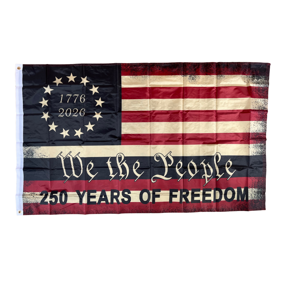 Distressed We The People flag with 1776–2026 and “250 Years of Freedom” design for America’s 250th celebration.