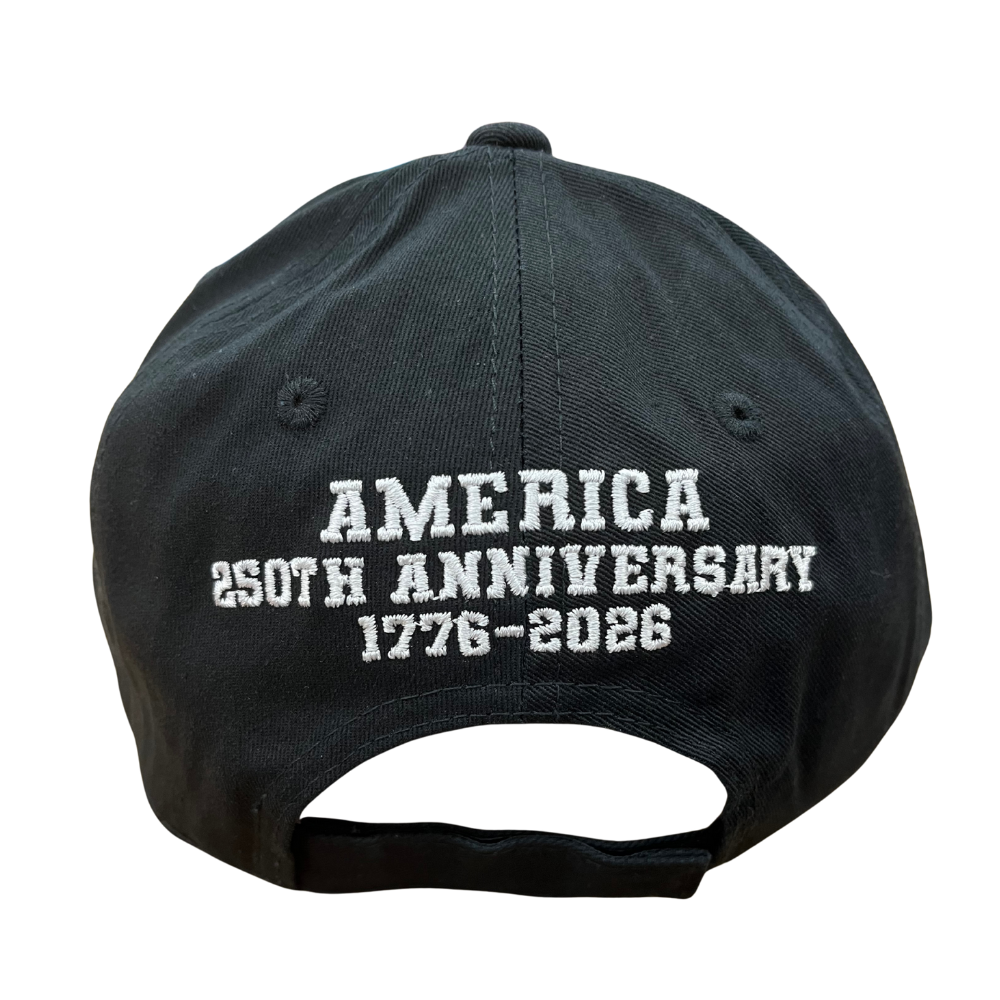 America 250th Anniversary Black Hat featuring front and back embroidery and American flag bill — celebrating 250 years of unmatched American strength and legacy.