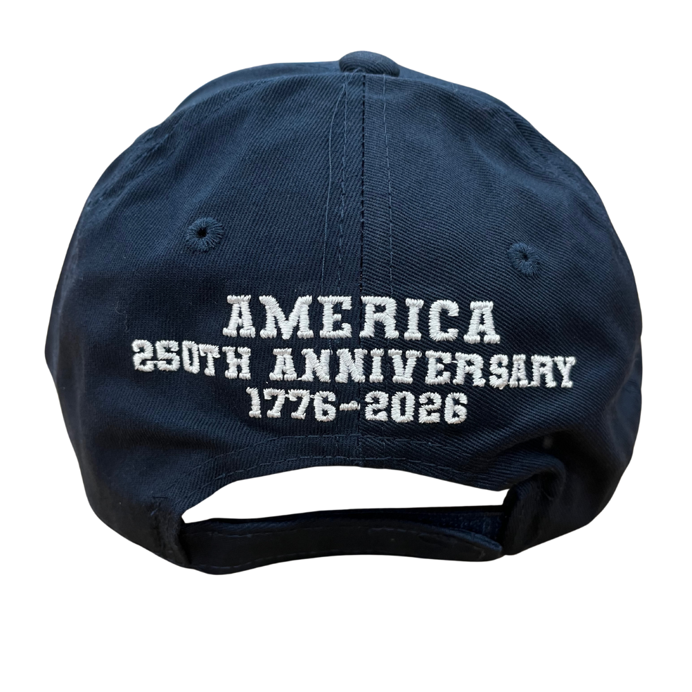 Honor the Semiquincentennial of the United States with the America 250th Anniversary Navy Hat — a striking symbol of our endurance, power, and purpose. Across the crown, raised embroidery proudly declares “AMERICA 250” with 1776–2026 stitched beneath — a timeless reminder of the nation that defined liberty for the modern world. The bill carries the American flag in sweeping red, white, and blue — a visual echo of the banner that’s led generations of heroes and innovators.