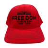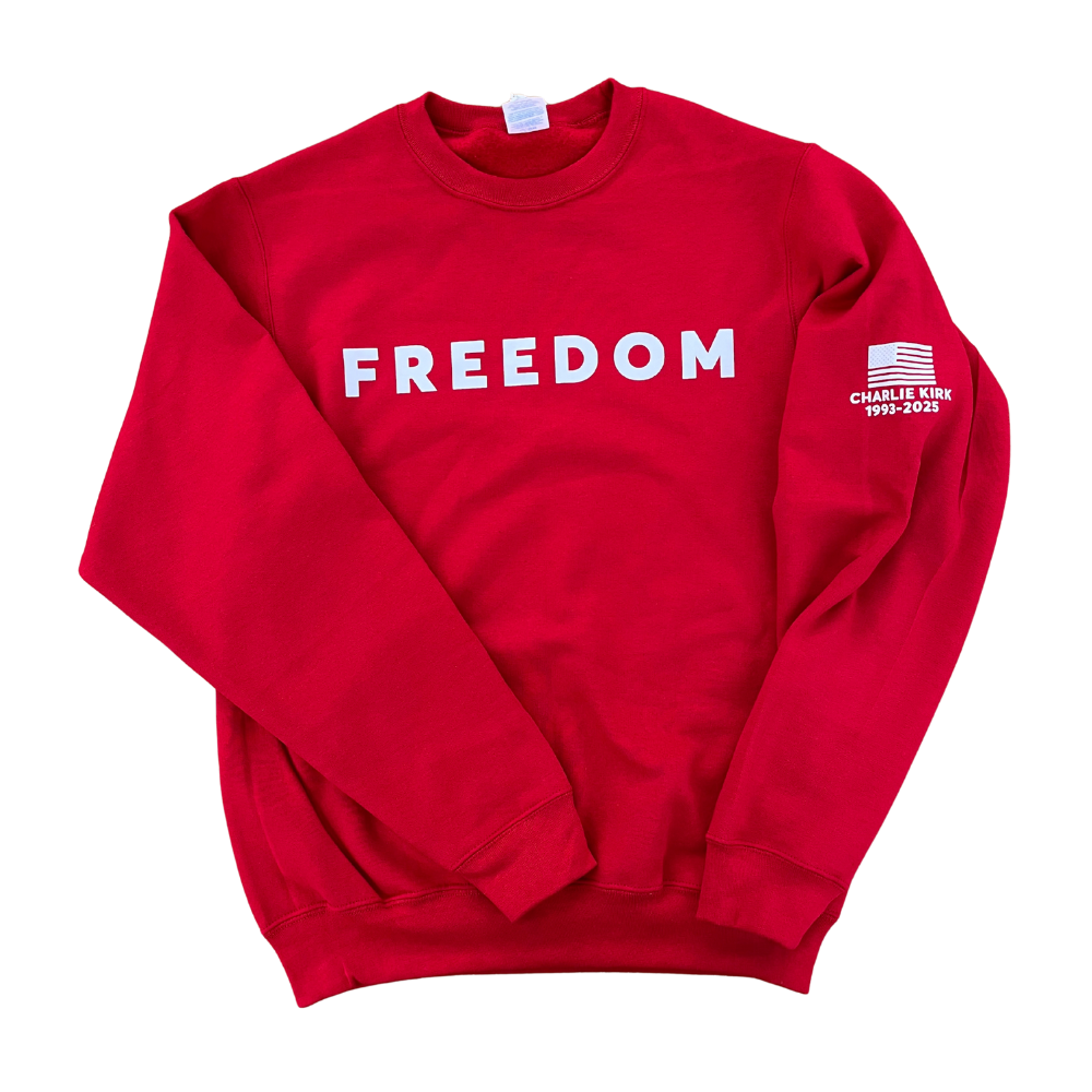 Red crewneck sweatshirt with bold white “FREEDOM” text and tribute design