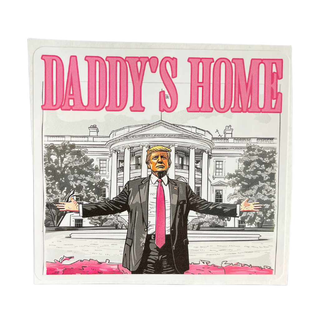 Pink Daddy’s Home Sticker — Durable, all-purpose adhesive vinyl sticker featuring bold American and political themes. Perfect for cars, laptops, tumblers, coolers, toolboxes, notebooks, and everyday gear.