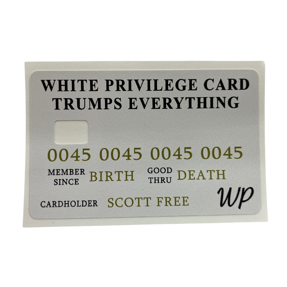 This credit card cover features a parody “membership card” layout with a silver background and black header text reading WHITE PRIVILEGE CARD TRUMPS EVERYTHING. The center includes a repeating “0045” number sequence along with mock card details such as Member Since: Birth, Good Thru: Death, and Cardholder: Scott Free. The design is framed in a rounded-edge rectangle and includes a small “WP” signature graphic in the corner.